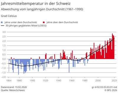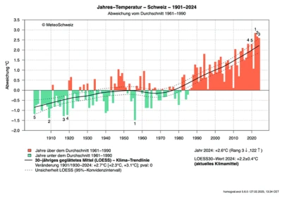 Burke, M. et al. (2015) Global non-linear effect of temperature on economic production. Nature 527, 235–239. LinkKlimawandel in der Schweiz: